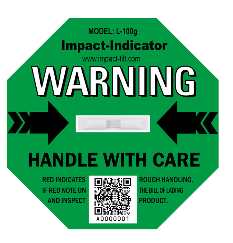 防震动标签是一张八角型的的强力胶贴标签,主要贴于货物的外包装箱上,在标签所受的外力超出其设定范围时,中间的核心晶管便会由白色转为红色,且不会复原。