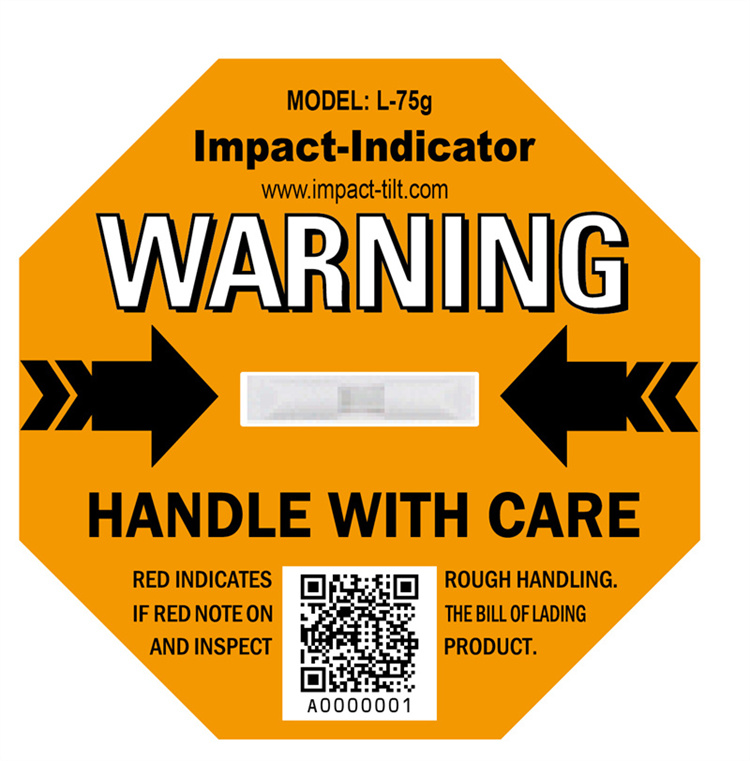 防震动标签是一张八角型的的强力胶贴标签,主要贴于货物的外包装箱上,在标签所受的外力超出其设定范围时,中间的核心晶管便会由白色转为红色,且不会复原。